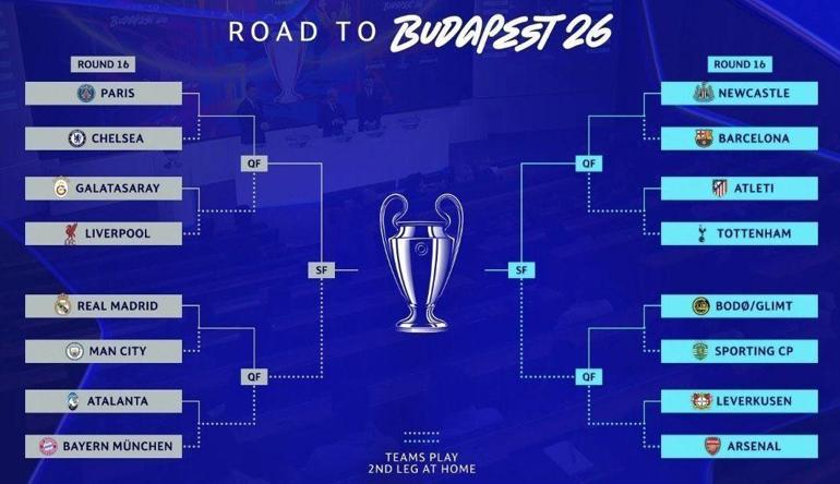 son 16’ya kalan takımlar belli oldu. Arsenal, Liverpool, Barcelona, Sporting, Atletico Madrid, Bayer Leverkusen, Atalanta, Paris Saint-Germain, Bayern Münih, Tottenham, Chelsea, Manchester City, Newcastle United, Bodo/Glimt, Galatasaray ve Real Madrid, son 16'ya kalan takımlar oldu.