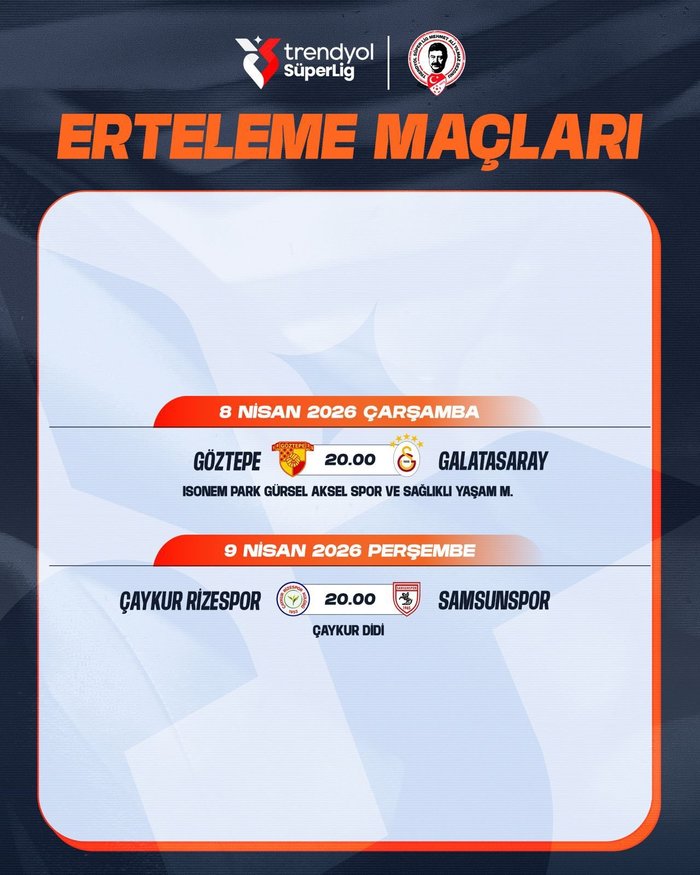 Göztepe-Galatasaray maçı, 8 Nisan Çarşamba günü saat 20.00'da oynanacak. Çaykur Rizespor-Samsunspor maçı ise 9 Nisan Perşembe günü saat 20.00'da başlayacak.